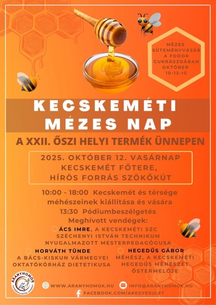 Az idei év újdonsága a vasárnapi Kecskeméti Mézes Nap volt, amelyen a térség méhészei mutatkoztak be kiállítással és vásárral. A pódiumbeszélgetés során szakemberek osztották meg a méz gyógyhatásait, betekintést nyújtottak a méhészet világába, és megmutatták, hogyan vált a méz a gasztronómia különleges alapanyagává. A programhoz csatlakozott a Fodor Cukrászda is, amely mézes sütemény vásárral várta a vendégeket Szabadság téri üzletében.